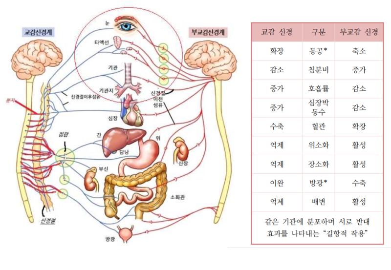 • 교감신경: 긴장, 홍분, 운동 시 활성(활성증가 시에는 심장기능 촉진, 혈관수축, 혈압상승, 소화기능 억제, 동공확대)