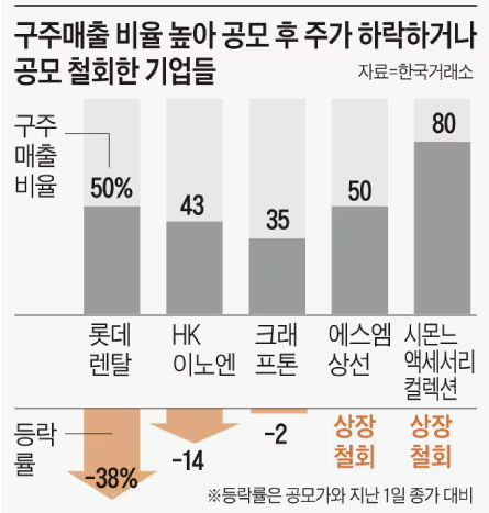 공모주가 높은 주식은 상장 실패 / 하락한 케이스도 다수입니다.