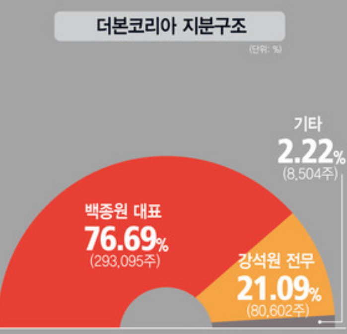현재 더본은 백종원 대표가 77%가량을 가지고 있고,