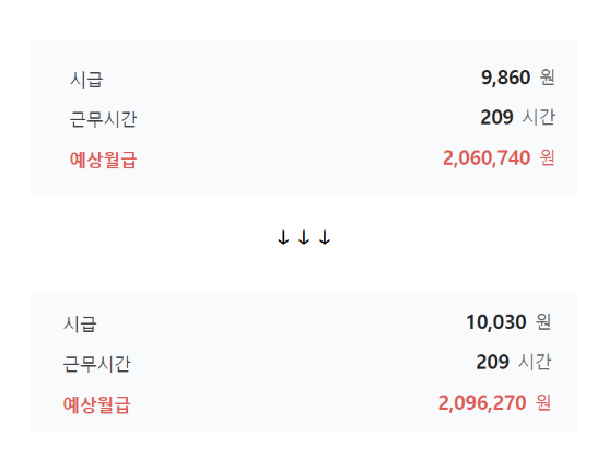 월급 1만 30원 X 209시간 = 2,096,270원