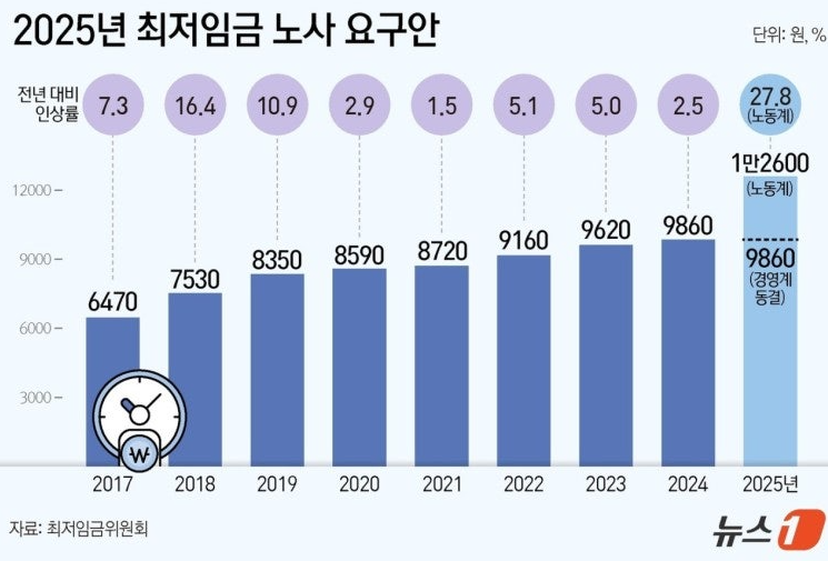 2025년 적용 최저임금이 올해(9860원)보다 1.7%(170원)오른 시급 1만30원으로 결정되자 노동계와 경영계 모두 비판을 쏟아냈다. 노동계에선 물가상승률에도 못 미치는 인상에 사실상 삭감이라는 비판